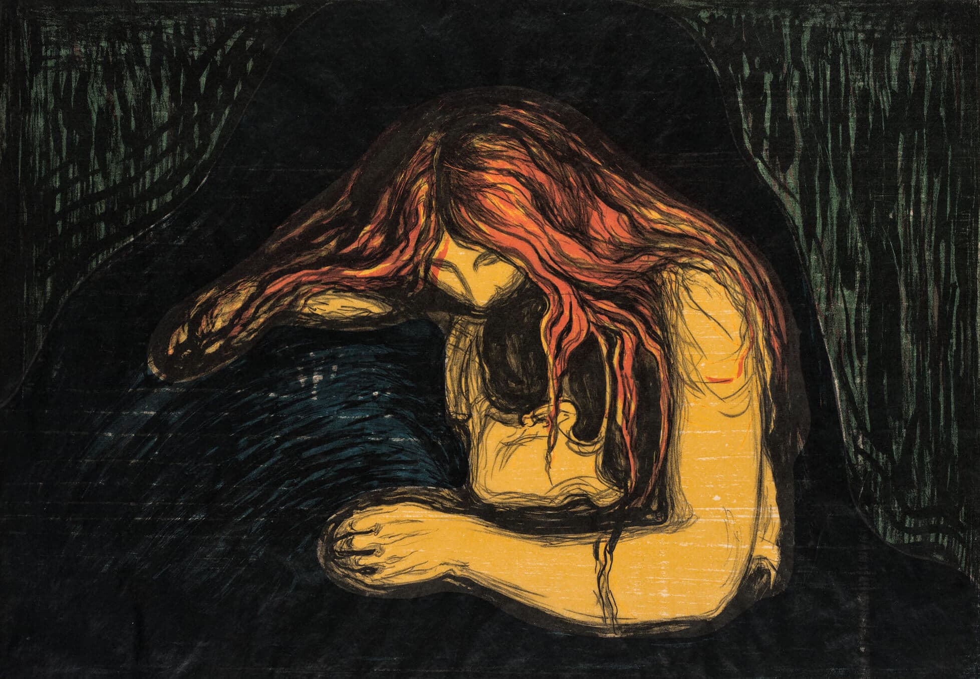 Three versions of the woodcut lithograph Vampire (1895–1902) further elucidate the era’s dreaded awe of women as sexual predators. Originally titled Love and Pain, Munch changed the title to Vampire at a friend’s suggestion to capitalize on his terror of passing the seeds of illness (he lost both his mother and a sister to tuberculosis as a boy and was frequently confined to his bed) and madness (evident in his father’s unhinged religious mania and another sister’s slow descent into schizophrenia) to successive generations. The lithograph’s pitch-black tusche serves as a key block over which woodcut—again sawed to separate colors—adds tone and atmosphere sustained by the omnipresent grain’s disquieting texture.