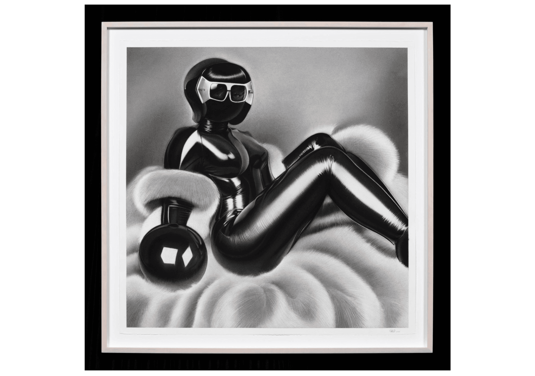 Once they have a plan, they work together on every piece, approaching a page or a canvas like co-quilters. Pisetti explained, “I’ll be watching what Josh is doing and try to make sure what I’m doing feels like what he’s doing, and then he’ll simultaneously be looking at what I’m doing and try to do that. Sometimes I’ll finish something and be like, ‘What you were working on looks so good!’ And he’ll say, ‘Really? I was just trying to copy what you’re doing.’ And then I’ll say, ‘Wait—I was copying what you were doing!’” “Kat and I imagine ourselves in these scenes,” Allen admits. “They will have our eyes or parts of our bodies in them. We are observers and performers. There’s a certain sense of drag, dress-up, and play.” Pisetti added: “We want to create these beautiful creatures and shield them with these beautiful things. It is very emotional. I feel like we can see ourselves in them, because we also want to be protected from the things in life that have harmed us.” At their studio, we also discussed how tight and revealing fetishwear has made its way into everyday life. There’s nowhere to hide. Yet, at “Bimboteque,” for as many machos, showgirls, and offbeat runaway models I observed, still so much suggested protection, what Allen called “highly crafted exterior shells.” I felt like I’d visited a members-only, safe-space sex club. Drawn zipped into a comprehensive catsuit, Bimbot (2023) posed on an opulent fur bed. She wore something like a bowling ball for a glove, and her Missy Elliott goggle sunglasses seemed snapped into her hair-shaped helmet above her face mask. In the painting Worship of the Lady From Behind (2023), the costumes of the entwined figures looked embroidered. They were not just getting busy on elegant furniture, they were merging with it.