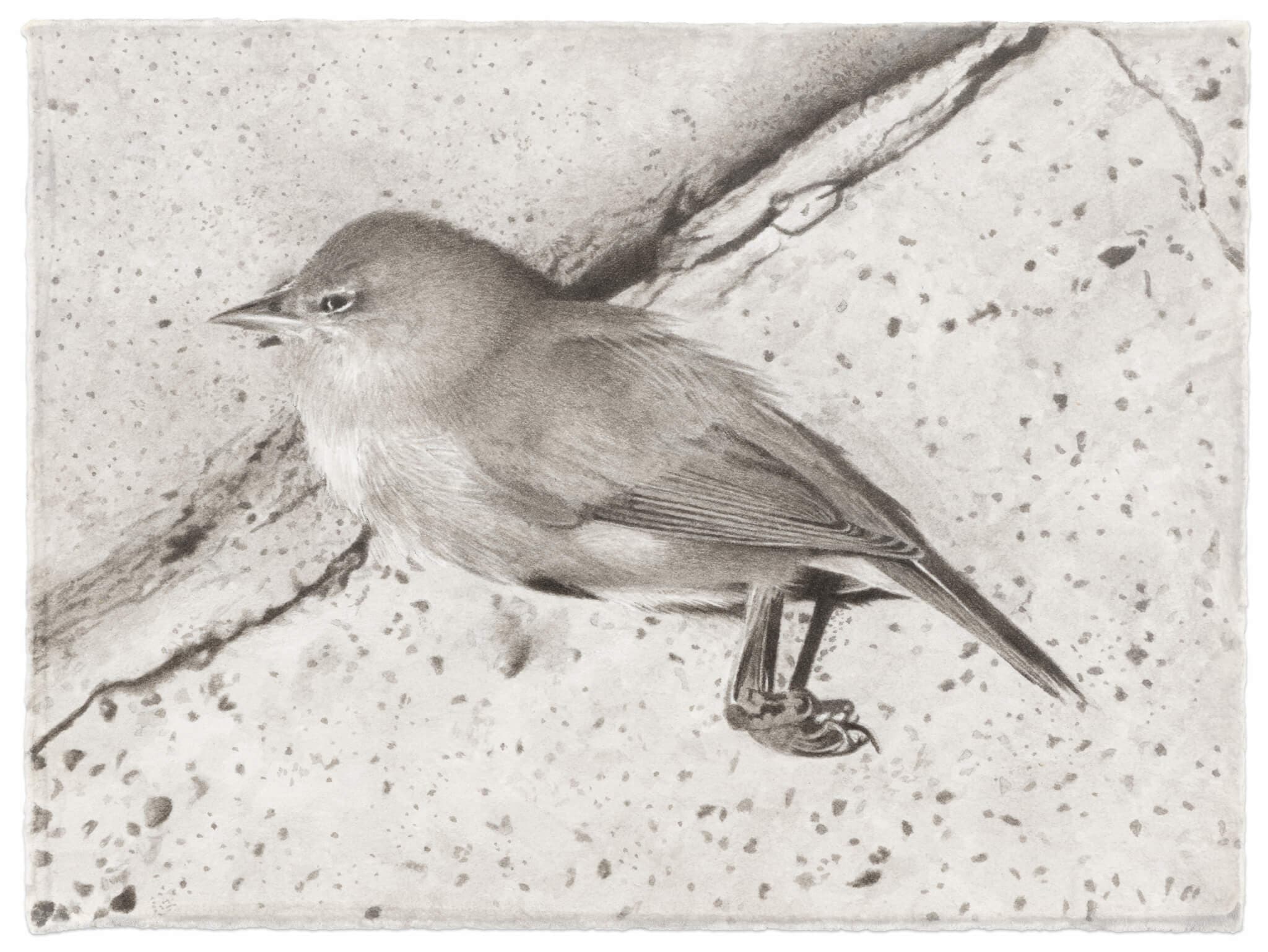 Seriality is not essential to the extraordinary graphite works of Jennifer Brou and India ink drawings of Meg Alexander. The large drawings of woodland scenes—Midsummer (2024), Early Spring (2024), and Winter Sunset (2025)—are from Brou’s frequent sylvan wanderings. There is nothing abstruse about them. They’re simple and straightforward except for the fact that they are also executed with exhilarating drafting skill. Her depiction of light is transcendent and the realization of every branch, bark, and leaf is miles beyond what they were just two years ago. Alexander’s seven Window Strike birds (all of which are from 2024, with the exception of one from 2025) also display bravura drafting. Each bird—and where it fell—is so exactingly realistic that the brain processes it as photography. Here, the seriality highlights how frequently this occurs, but that is incidental.