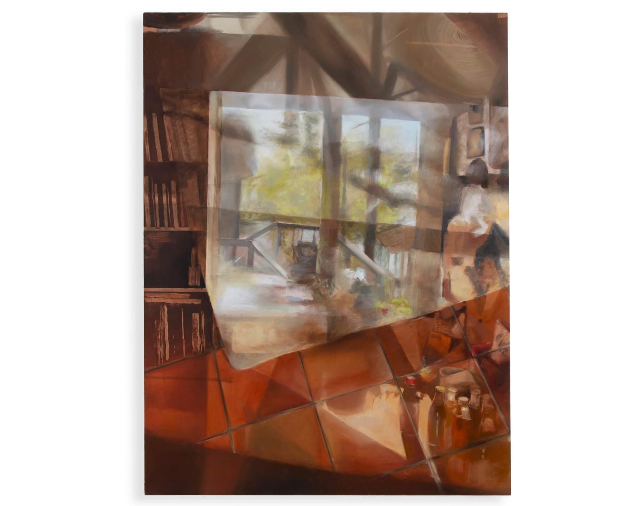 One thrilling revelation is Ellen Weitkamp, a relative newcomer to the state. Though technically it is painting—and virtuosic painting at that—her work also borrows from collage and photography. Early Afternoon Light (2024) is unsettling in its denial of static space. We seem to be looking at a room from several distorting angles at once and in various light conditions, as if its components are assembled and layered atop each other rather than depicted head on. Areas of it appear hyperrealist and glossy like a photograph. When there are figures, as in April 5, 2024 (2025), they don’t seem relaxed, but restless and pensive, charging the scene with ennui.