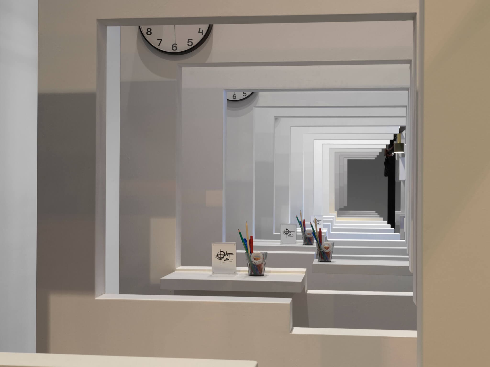 The second gallery is entirely dedicated to Virgo (2022), a large set-like installation involving twenty-eight wall partitions divided into two sections. Viewers can walk along the sides or through a central corridor. In appearance, the sliced space represents a typical rental apartment with neutral walls and familiar furniture, with all the rooms of a home—living room, bathroom, kitchen, and bedroom—lacking any distinguishable items. Virgo takes its name from the constellation as well as the Parthenon, which was dedicated to the virgin Greek goddess Athena Parthenos. Its architecture, like the artwork, is made of repeating forms and techniques that create optical illusions. The partitions of Virgo have square openings throughout, allowing the viewer to see inside and through the various walls at one time. This causes aspects of the work to disappear and reappear based on the viewer’s location and the way the work is activated.