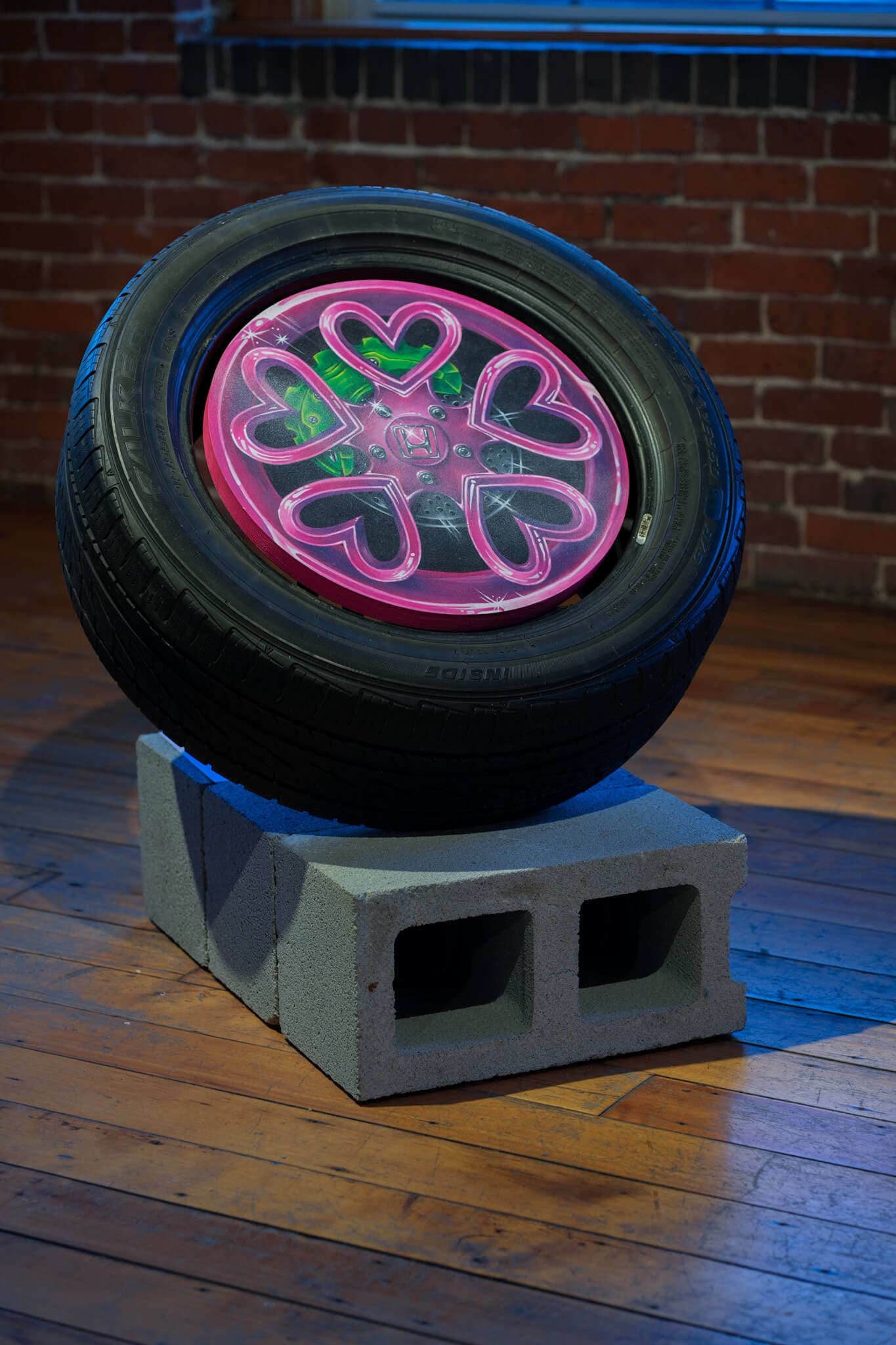 Rixy, Off We Go, detail, 2024. Acrylic and spray paint on wood mounted on a tire. Courtesy of Essex Art Center.