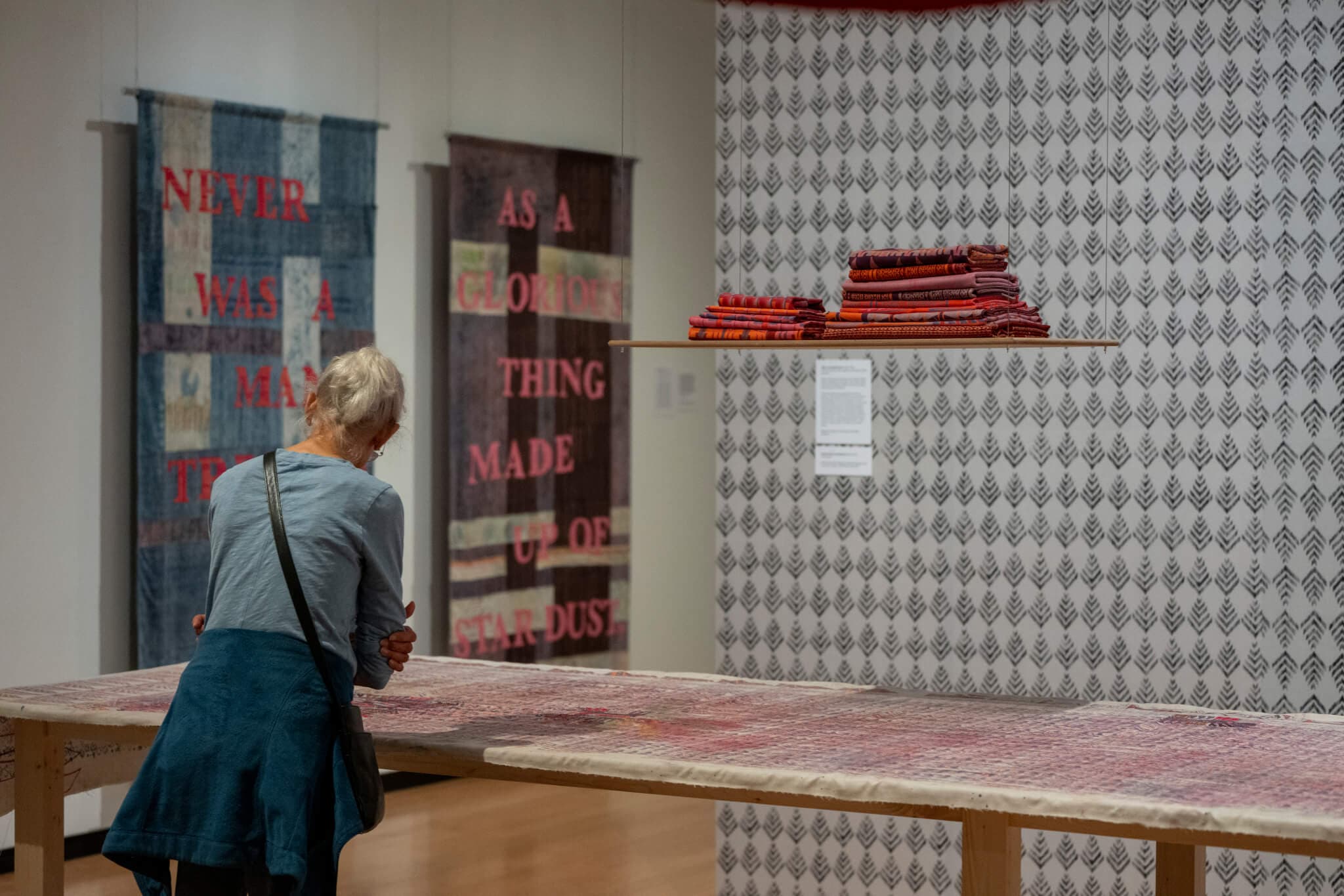 The fabric’s bolt-like scale, at approximately twenty-three feet long, evokes industry, while the decorative quality of the motif on the repeating indigo and red patterns recall domestic objects such as pillows or curtains. At the same time, the block-printing technique asserts the handmade, placing craft in direct conversation with these other associations. Across the exhibition, these layered spaces—the sacred or spiritual, the industrial or industrious, and the domestic—intersect through the fabric’s materiality and the forms it assumes. Consider Never Was a Man (2025), two twin-sized quilts bearing appliquéd text that reads “Never was a man treated as a mind” and “As a glorious thing made up of stardust.” The wall text reveals these as quotations from the suicide note of student Rohith Vemula, whose death brought caste-based discrimination in the Indian university system to international attention. Much of Tamhane’s work engages with the hierarchies and caste structures of her Indian ancestry. Born in Canada in 1976, yet culturally connected to India, she brings both an insider’s and outsider’s perspective. While her references are grounded in Indian history, the inquiry reaches further, examining broader systems of hierarchy: craft and industry, power and disenfranchisement, lineage and labor.