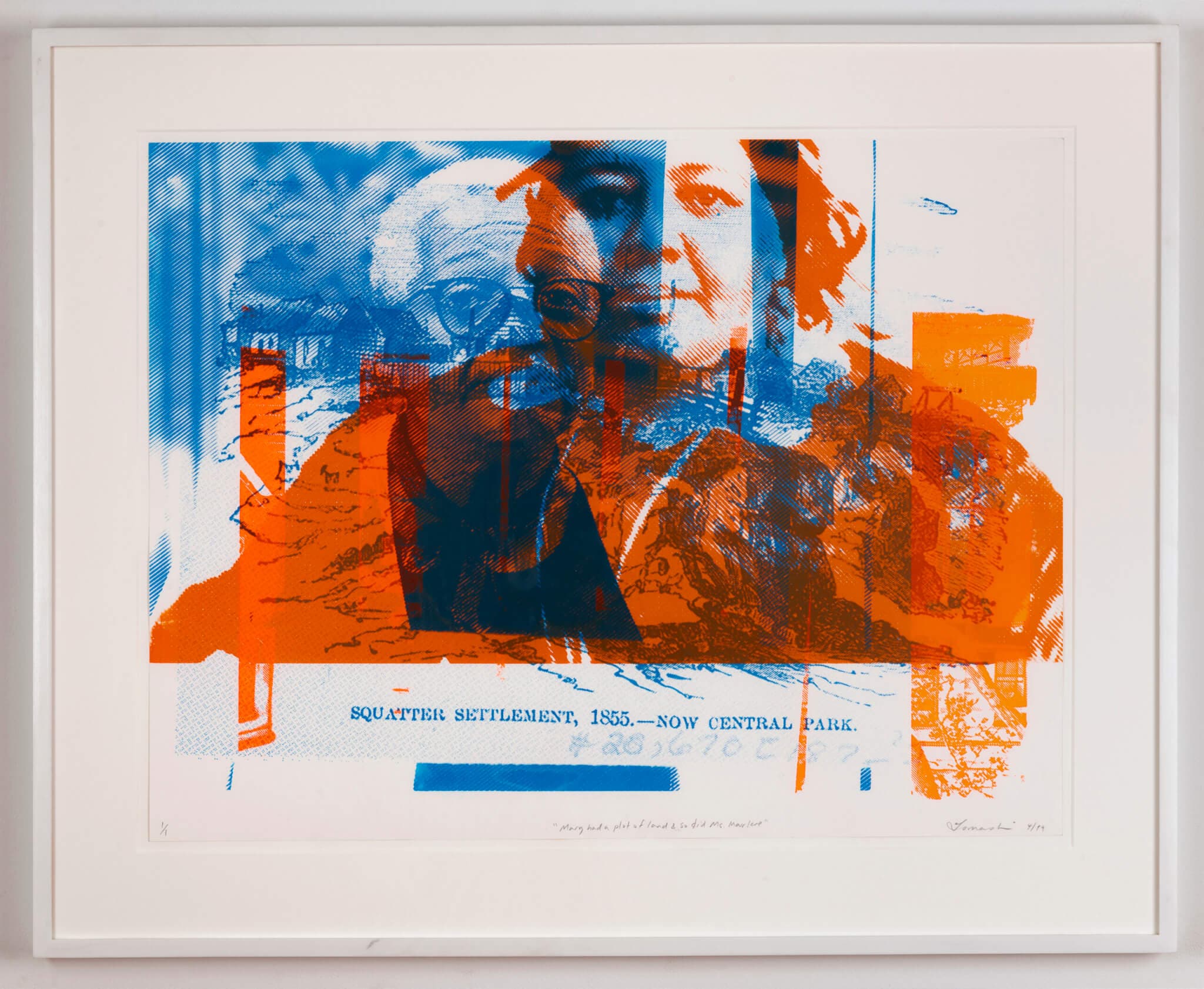 A couple of years later, when Jackson exhibited in the 2019 Whitney Biennial, she took a similar approach, delving into the history of the displacement of Black and Brown people in New York City. Jackson followed the city’s use of the Third Party Transfer Program to target homeowners of color with forced foreclosures. She scoured city archives to learn about the Black middle-class community of Seneca Village that was destroyed using eminent domain in order to create Central Park in 1857. In New Money (Mary had a plot of land & so did Ms. Marlene) (2019) Jackson partially eclipses halftone photographs of present-day homeowners and archival images of Seneca printed in eye-catching hues of orange and blue. Their placement and color signal a pattern of oppression and cue a sense of urgency to hold space for history as we consider present predicaments.